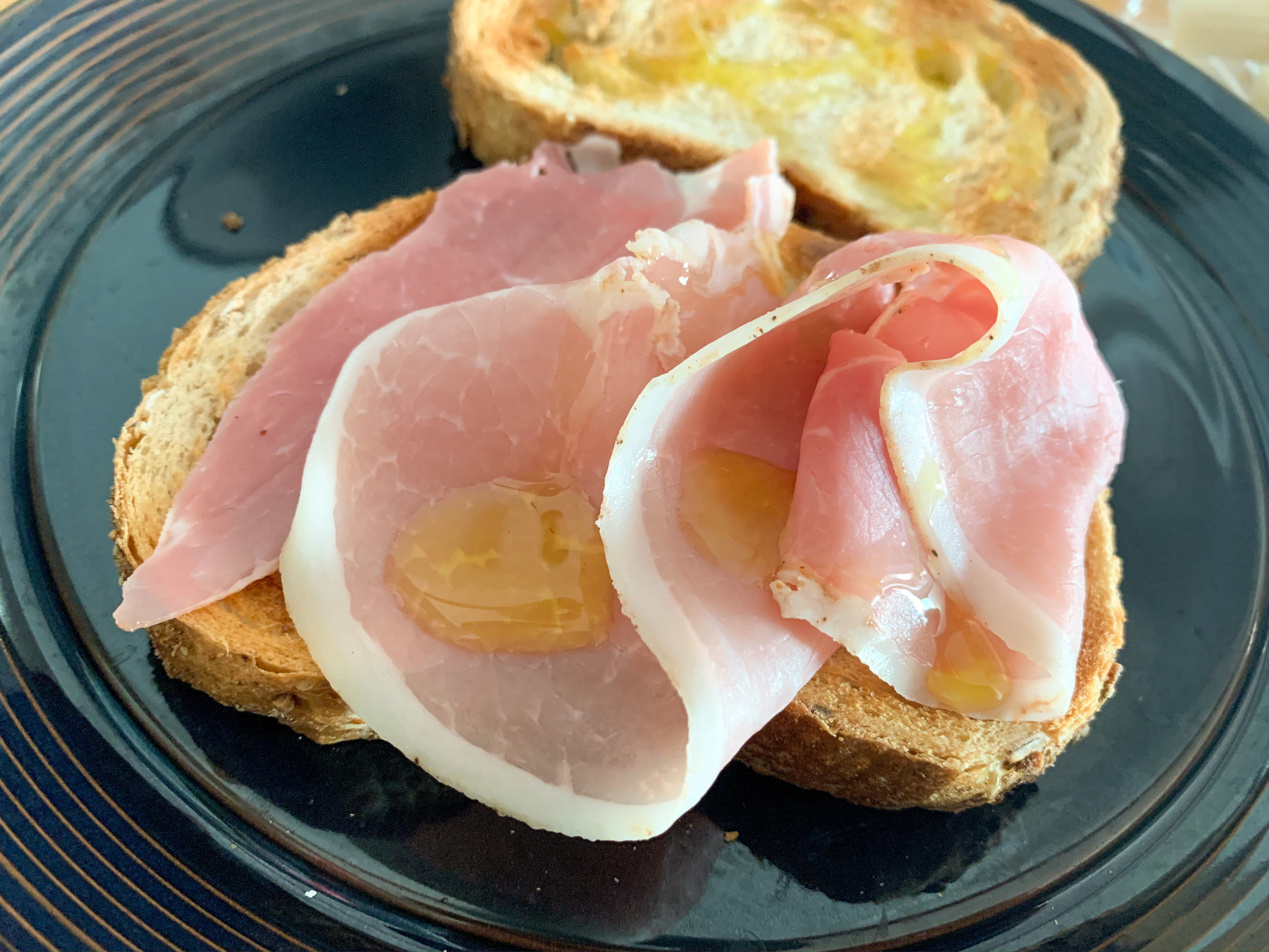 햄 위에 올리브오일을 뿌려주면 생명수를 부은 것 같은 비주얼. 이렇게만 먹어도 맛있다.