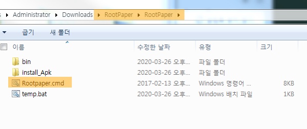 먼저 파일을 다운 받아 폴더를 열면 위 사진처럼 폴더와 파일들이 보이는데 이 중에서 Rootpaper.cmd 파일을 선택